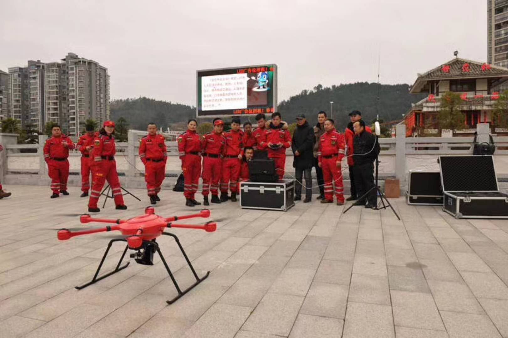 2018年1月13日,由貴陽市防震救災(zāi)中心、黔南州惠水縣人武部、惠水縣公安局組織,貴州紅箭救援隊在黔南州惠水縣好花紅廣場進行救援演練大會,智璟科技攜T60V2救援無人機(紅色)應(yīng)邀出席此次演練大會。