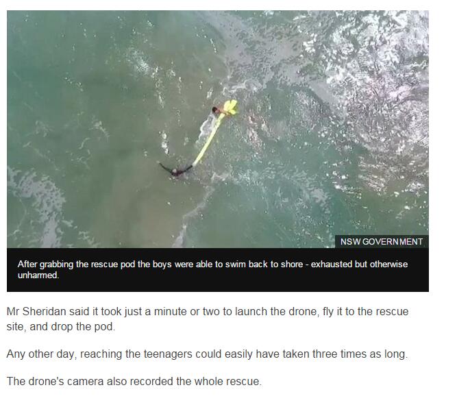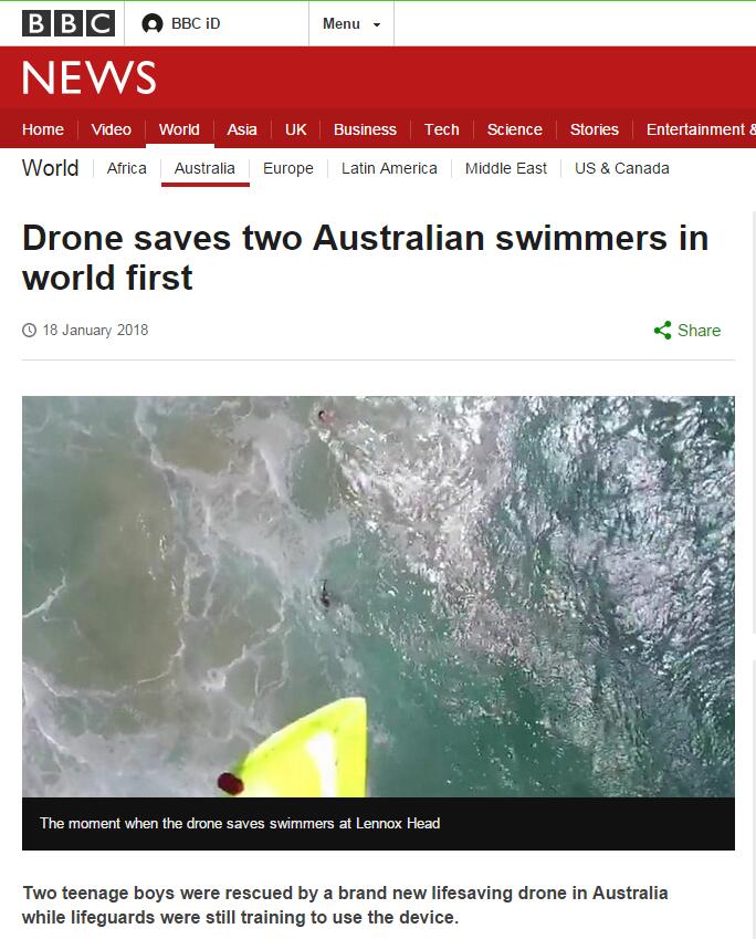 英國BBC報道澳大利亞首次使用無人機(jī)成功救援2名落海男孩