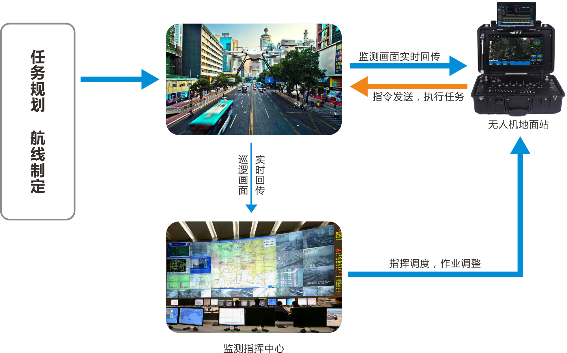 JTT無人機(jī)應(yīng)急指揮調(diào)度平臺(tái)可將無人機(jī)飛行平臺(tái)與城管部門系統(tǒng)無縫隙地連接成一個(gè)有機(jī)整體,解決無人機(jī)在城管執(zhí)法單位應(yīng)用中存在的技術(shù)難點(diǎn)及應(yīng)用盲區(qū)。JTT無人機(jī)應(yīng)急指揮調(diào)度平臺(tái)依托公網(wǎng)3G、4G以及專網(wǎng)4G LTE等多種無線網(wǎng)絡(luò)技術(shù)實(shí)現(xiàn)無人機(jī)空中實(shí)時(shí)視頻監(jiān)控并傳送相關(guān)畫面或視頻到移動(dòng)指揮平臺(tái),后臺(tái)系統(tǒng)根據(jù)相關(guān)視頻或畫面進(jìn)行智能識(shí)別和分析,匯總得出相關(guān)人員、車輛、現(xiàn)場與周邊情況為指揮人員或相關(guān)領(lǐng)導(dǎo)提供人力部署、應(yīng)急處理提供決策依據(jù)和技術(shù)保障。