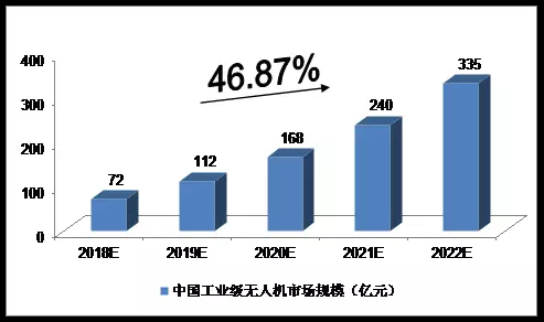 市場規(guī)模預(yù)測 綜合以上因素,我們預(yù)計(jì),2018年中國工業(yè)級無人機(jī)市場規(guī)模將達(dá)到72億元,未來五年(2018-2022)年均復(fù)合增長率約為46.87%,2022年中國工業(yè)級無人機(jī)市場規(guī)模將達(dá)到335億元。