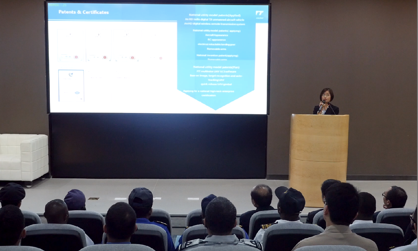 智璟科技COCO女士在演講臺(tái)上給使團(tuán)們介紹JTT工業(yè)無(wú)人機(jī)