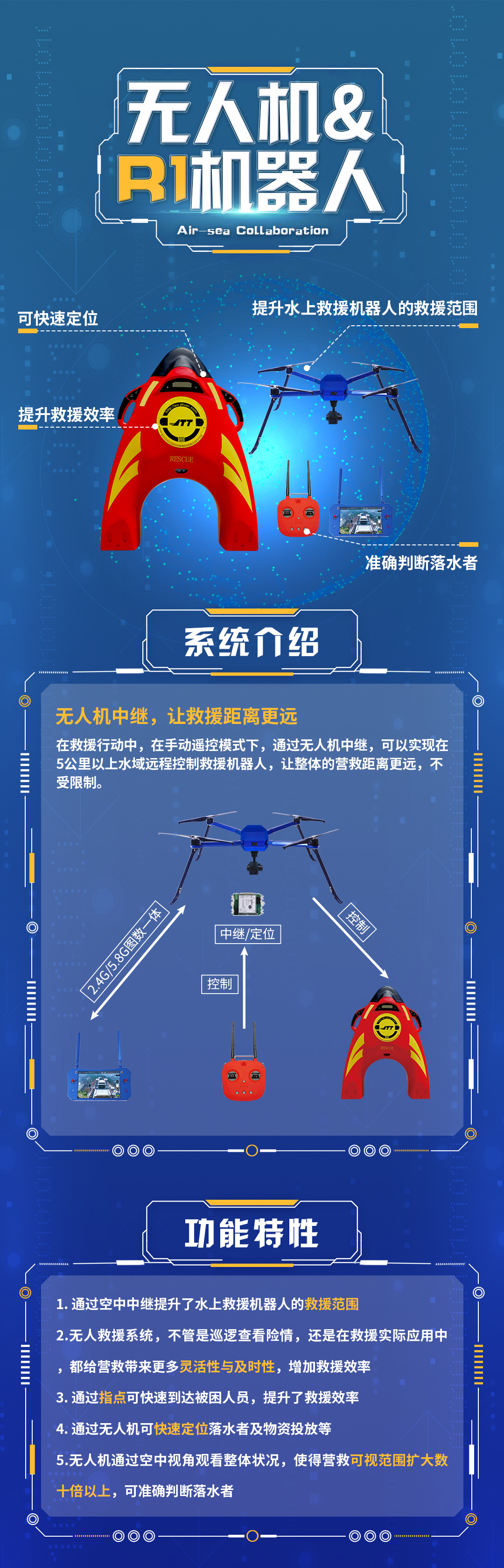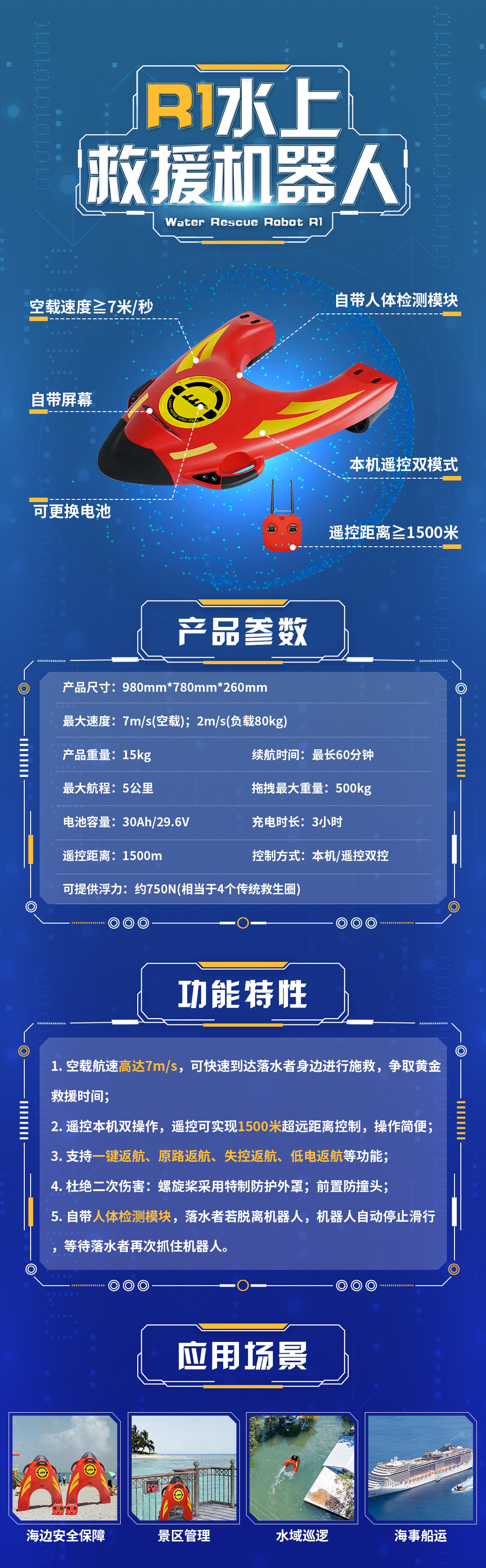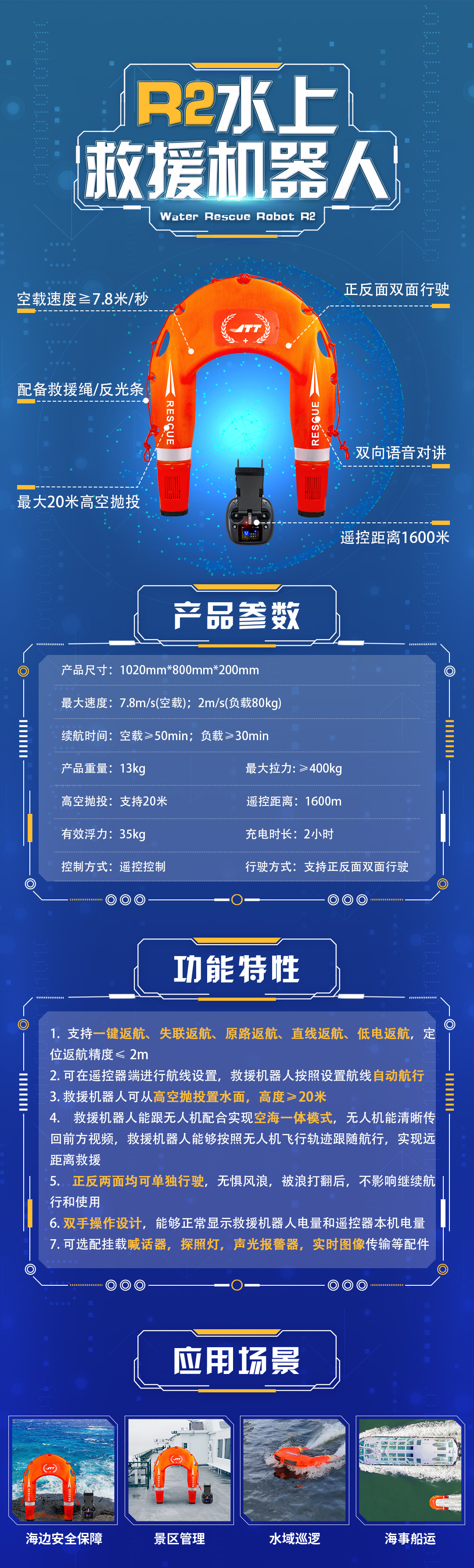無人化水域救援可以應(yīng)用到多個行業(yè)里,比如,旅游業(yè)的景區(qū)管理、海邊安全保障、水域巡邏,運輸業(yè)的海事船運,消防行業(yè)的抗洪救災(zāi),潛水打撈行業(yè)的水下搜尋及打撈、船體檢測等。當(dāng)中可應(yīng)用到上述場景的裝備有水上救援機器人、水上救援艇以及水下機器人。R1/R2水上救援機器人專注于水域環(huán)境中1-3人的緊急救援、水域巡邏,在日常的巡邏工作中,如果發(fā)現(xiàn)不慎落水者,救援隊可以隨時拋投R1/R2出發(fā),遙控操控,并以最快7.8m/s的速度,抵達(dá)落水者身邊;T1水上救援艇專注于4-6人大規(guī)模的水域救援,入水自動充氣識別,可以搭載對講、喊話、照明設(shè)備,遙控操控,在洪災(zāi)救援、內(nèi)河、輪渡等場景運作高效;P1水下機器人專注于水下的搜尋、拍攝、打撈、檢查,具備鋁合金緊湊型機身,可以避免蛙人在寒冷天氣下的水下工作。