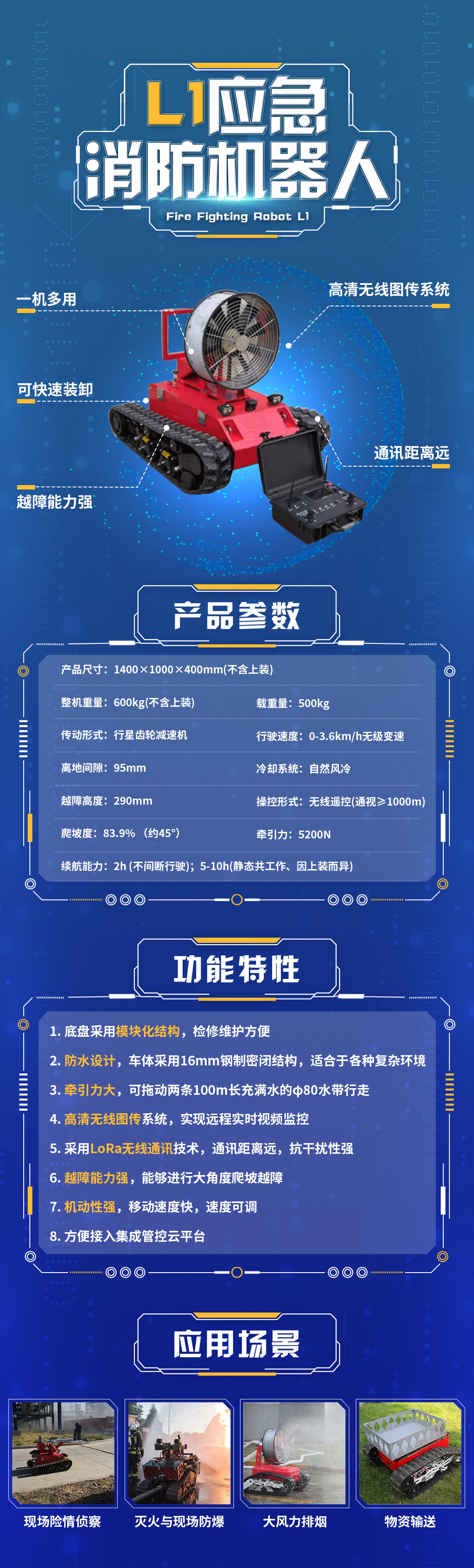 從19世紀(jì)末開始全球開始?xì)鉁厣?,平均氣溫上升?.3~0.6度,隨之而來的是一系列的環(huán)境災(zāi)害,而火災(zāi)就是其中一種。每年,在不管是成功營救或者是損失的數(shù)字背后,都是以一條條消防員/受害者生命所疊加而成的。而無人化消防救援解決方案卻能夠為此帶來低損失成本和高滅火救災(zāi)效率。L1應(yīng)急消防機器人,它能夠充當(dāng)消防員進行現(xiàn)場險情偵察、緊急滅火、大風(fēng)力排煙、探測巡檢、物資輸送、現(xiàn)場防爆。