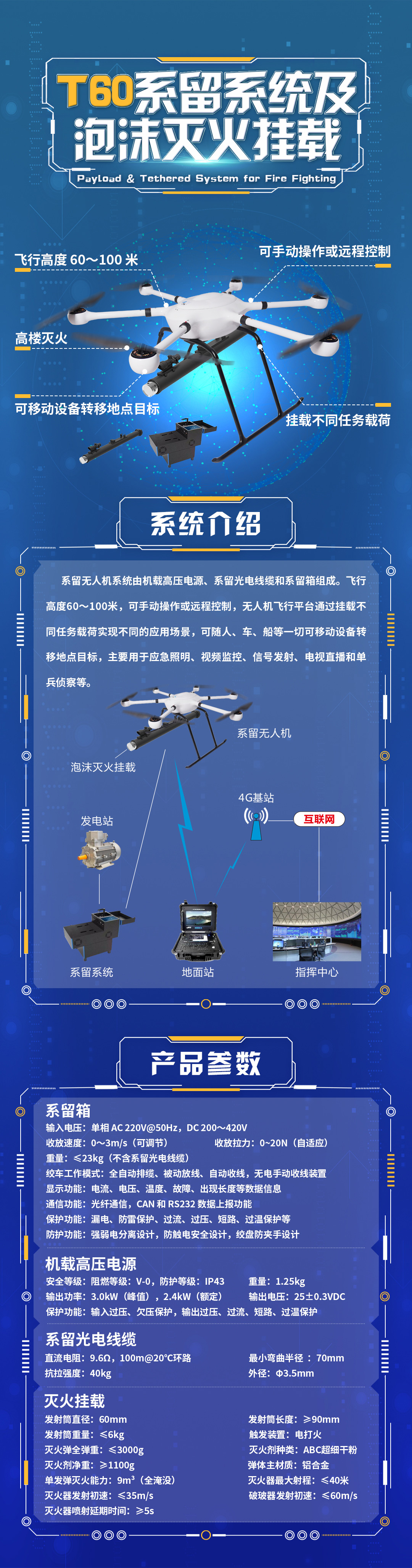 任務(wù)進行時,高樓有65米高,著火點剛好位于該樓的最高樓,隨即應(yīng)急隊立即派出T60系留無人機進行單兵偵察,系留無人機高度可以達(dá)到60-100米,搭載了泡沫滅火和高清攝像機云臺,可以一邊讓系留系統(tǒng)供電,讓其長時間飛行,一邊回傳室內(nèi)著火情況,同時也執(zhí)行著滅火的任務(wù)。畫面上看到該層樓辦公室因為位置的長地毯著火了,同時引燃了電腦設(shè)備和打印紙,應(yīng)該是在沒人發(fā)現(xiàn)的地方發(fā)生的,濃煙滾滾。但沒有觀察到具體的人員,判斷已經(jīng)基本撤離。隨后T60使用泡沫滅火掛載,發(fā)射ABC超細(xì)干粉,在消防員沒趕到前將火情盡可能控制。無人機連續(xù)工作了7分鐘,火苗已逐漸熄滅,現(xiàn)場工作人員也已趕到。無人機成功在應(yīng)急隊到達(dá)著火點之前協(xié)助滅火,降低風(fēng)險,本次疏散大樓380人,該單位涉及人數(shù)達(dá)到80人,均無傷亡報道。