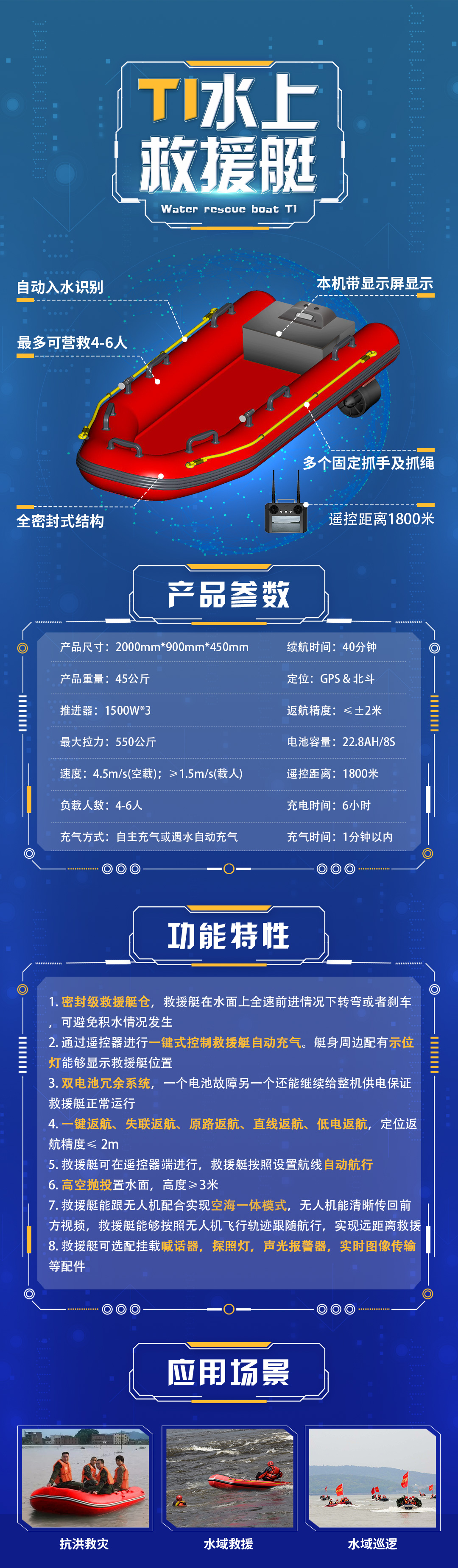 水上救援受地形、外環(huán)境變化的影響,救援難度也不一樣,比如,在寒冷天氣中的溺水救援。救援人員則可以通過拋投水上救援機器人,讓其立即出發(fā),在最短的時間內(nèi)讓溺水人員抓住機器人,獲得呼吸的機會,并由機器人帶回岸上。又或者,為了應(yīng)對雨季發(fā)生的洪災(zāi),使用水上救援艇,實施大規(guī)模救援,保障生命。