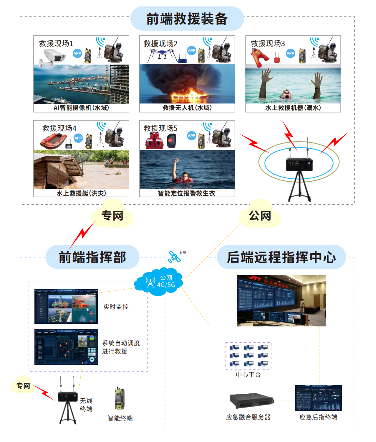 1,據(jù)網(wǎng)絡(luò)情況,選公網(wǎng)+專網(wǎng)通信,選指前端指揮部,一線人員進入現(xiàn)場打開現(xiàn)場指揮中心、前端救援裝備,前端(A!智能攝像機、水上救援機器人、水上救援艇、無人機、智能定位報警救生衣等)接入現(xiàn)場指揮中心,現(xiàn)場指揮中心自動接入后端遠程指揮中心;
