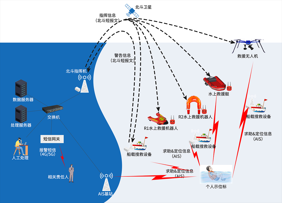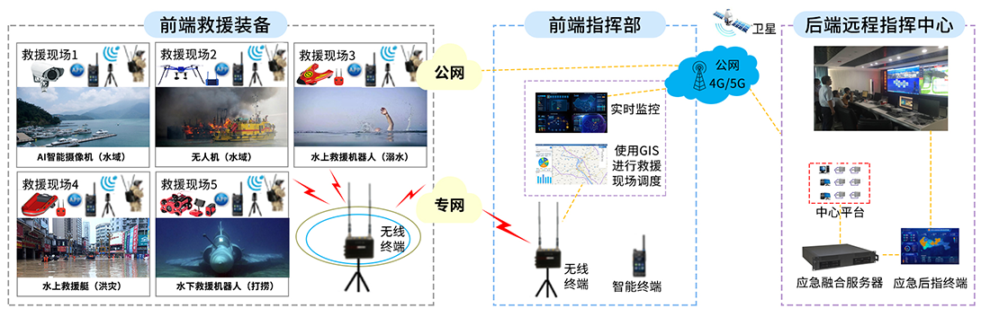 JTT水域救援系統(tǒng)是針對(duì)上述水域救援調(diào)度存在的問題,自主研發(fā)的一套集后端遠(yuǎn)程指揮中心、前端指揮部及前端救援裝備于一體的水域救援系統(tǒng),后端指揮中心應(yīng)急指揮平臺(tái)分級(jí)管理及調(diào)度,前方救援現(xiàn)場(chǎng)數(shù)據(jù)的上傳并及時(shí)進(jìn)行指令的下達(dá),從而提高決策效率和救援效率。所有前端智能設(shè)備均與前端指揮部及后端指揮中心通過(guò)無(wú)線進(jìn)行通信,前端遠(yuǎn)程指揮中心根據(jù)其所接收的智能設(shè)備數(shù)據(jù)統(tǒng)一進(jìn)行調(diào)度,指揮救援工作有序進(jìn)行。