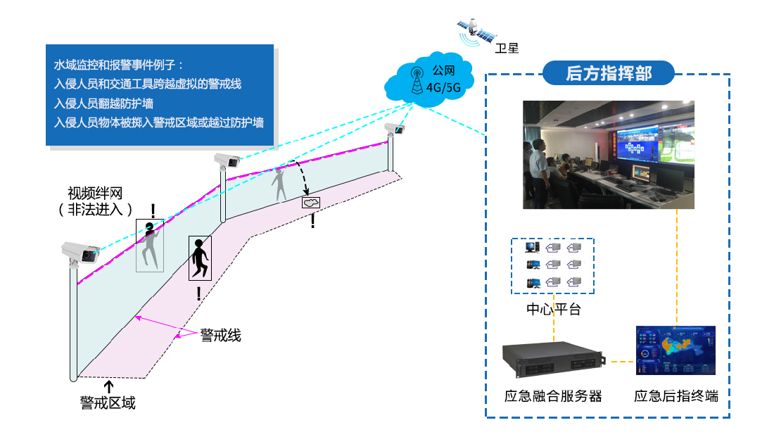 針對(duì)固定水域周邊部署AI智能攝像機(jī),對(duì)不適宜人去游泳容易發(fā)生意外事故的區(qū)域設(shè)置警戒區(qū)域,無(wú)人值守的情況下,在視頻畫面中設(shè)置虛擬警戒區(qū)(單線、雙線、矩形或者不規(guī)則多邊形),判別人員入侵,在后端指揮系統(tǒng)觸發(fā)報(bào)警。還可聯(lián)動(dòng)語(yǔ)音設(shè)備,進(jìn)行語(yǔ)音呼叫。若出現(xiàn)溺水情況后端指揮中心立
