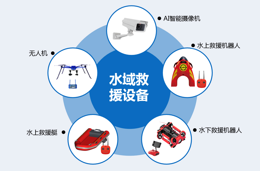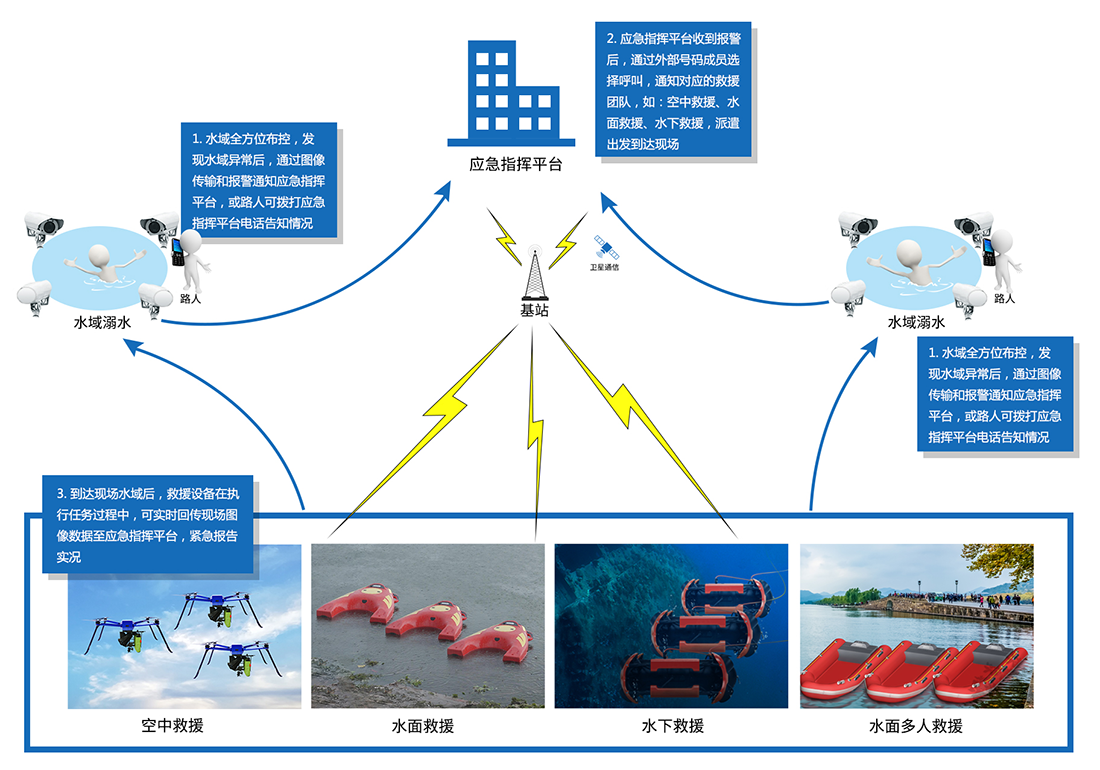 水域救援系統(tǒng)前端智能救援設(shè)備主要包括水域AI智能攝像機(jī)、空中救援無(wú)人機(jī)、水上救援機(jī)器人、水上救援艇、水下救援機(jī)器人等,組成從空中、水面、水下立體化救援系統(tǒng),應(yīng)對(duì)不同的救援場(chǎng)景需求,所有前端智能救援設(shè)備均與前端指揮部及后端指揮中心組成一體,聽命于應(yīng)急管理平臺(tái)的統(tǒng)一調(diào)度,讓指揮救援工作有序、有效地進(jìn)行。