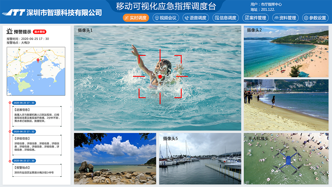 后端收到前端監(jiān)控設(shè)備回傳的數(shù)據(jù)畫面、圖像畫面等信息,后端可跟前方進(jìn)行視頻會(huì)商,并針對(duì)救援現(xiàn)場(chǎng)狀況迅速派遣救援設(shè)備和救援人員,以最高效的方式降低風(fēng)險(xiǎn)和損失。
