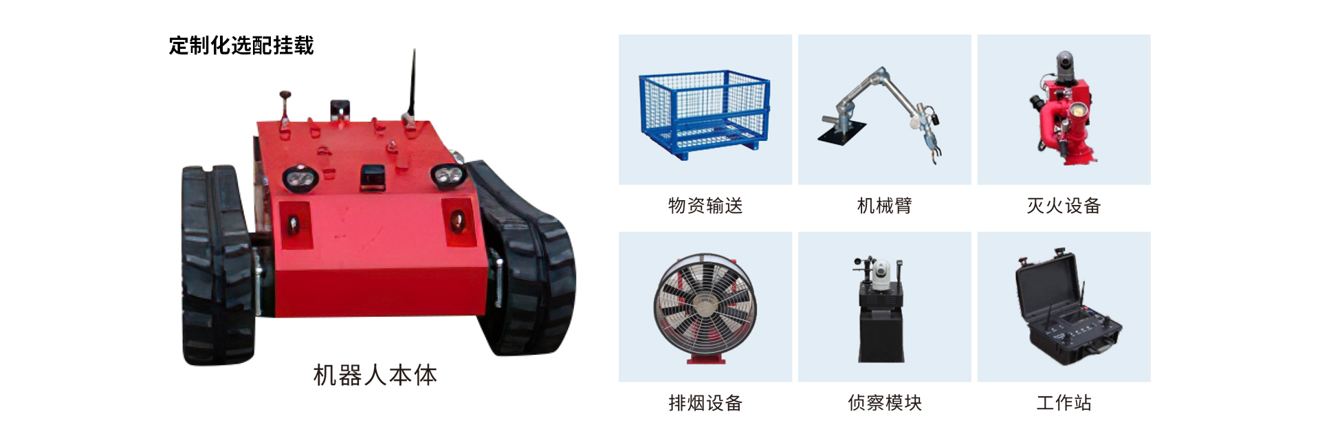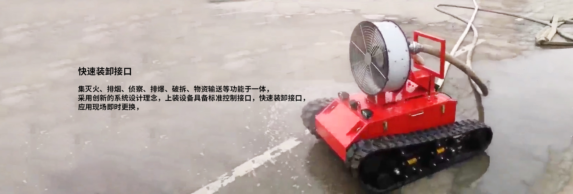 · 快速裝卸接口:集滅火、排煙、偵察、排爆、破拆、物資輸送等功能于一體,采用創(chuàng)新的系統(tǒng)設(shè)計(jì)理念,上裝設(shè)備具備標(biāo)準(zhǔn)控制接口,快速裝卸接口,應(yīng)用現(xiàn)場(chǎng)即時(shí)更換。
