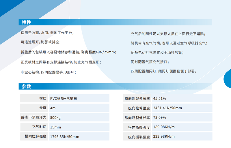 用于水域中快速通行,靜態(tài)下承載浮力500kg;可折疊,材質(zhì)為橡膠涂覆織物