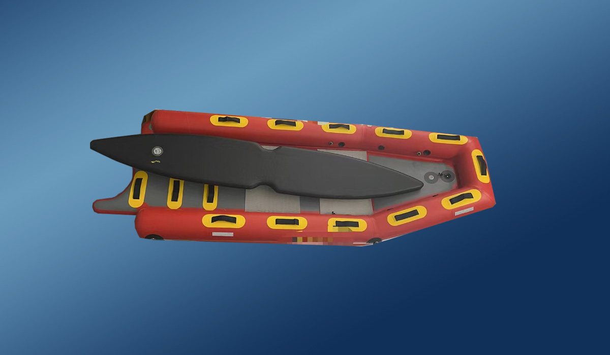 充氣底板尾端帶有5個(gè)橡膠把手;側(cè)邊帶有4個(gè)金屬連接環(huán);前端帶有1個(gè)金屬連接環(huán)