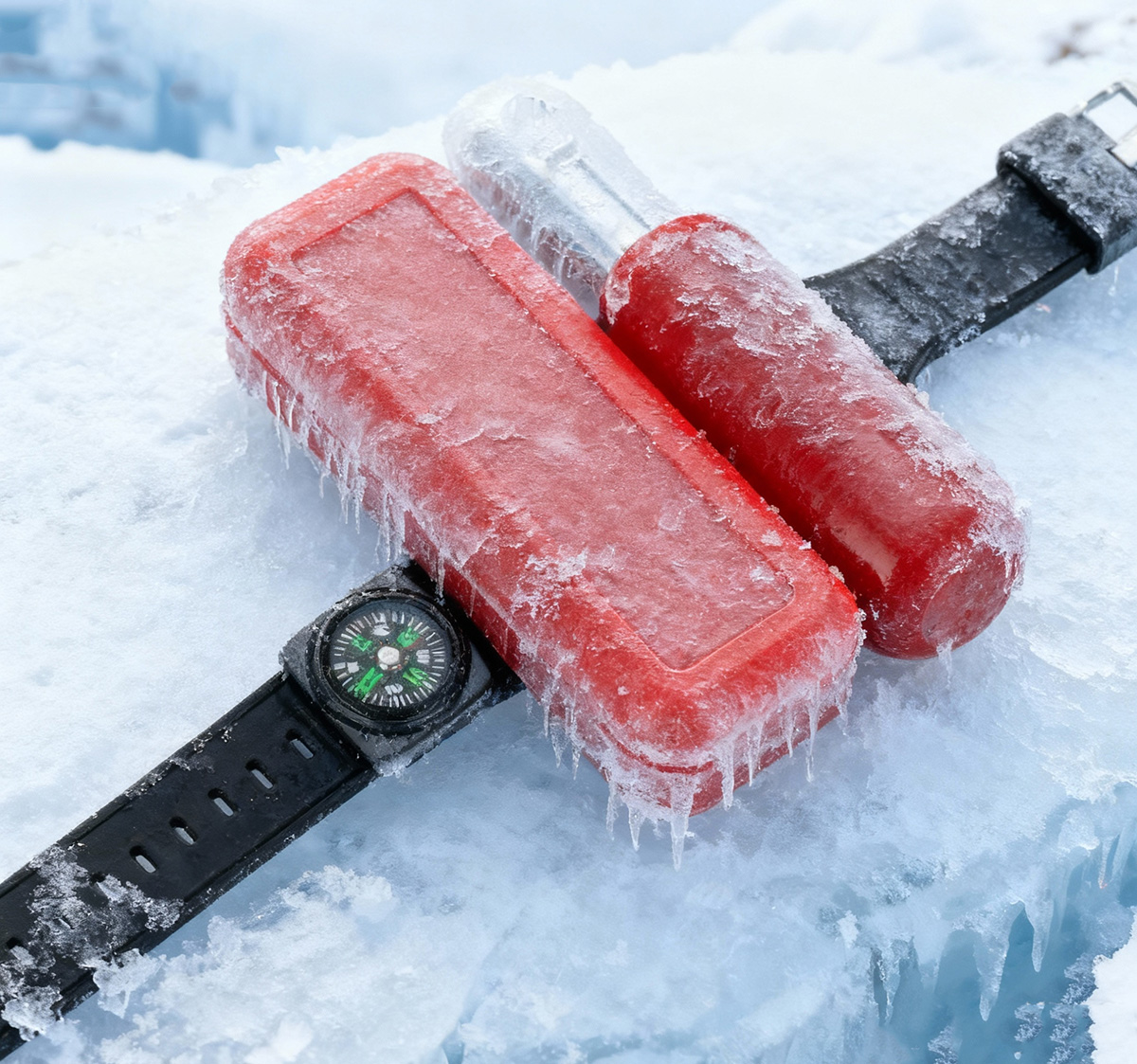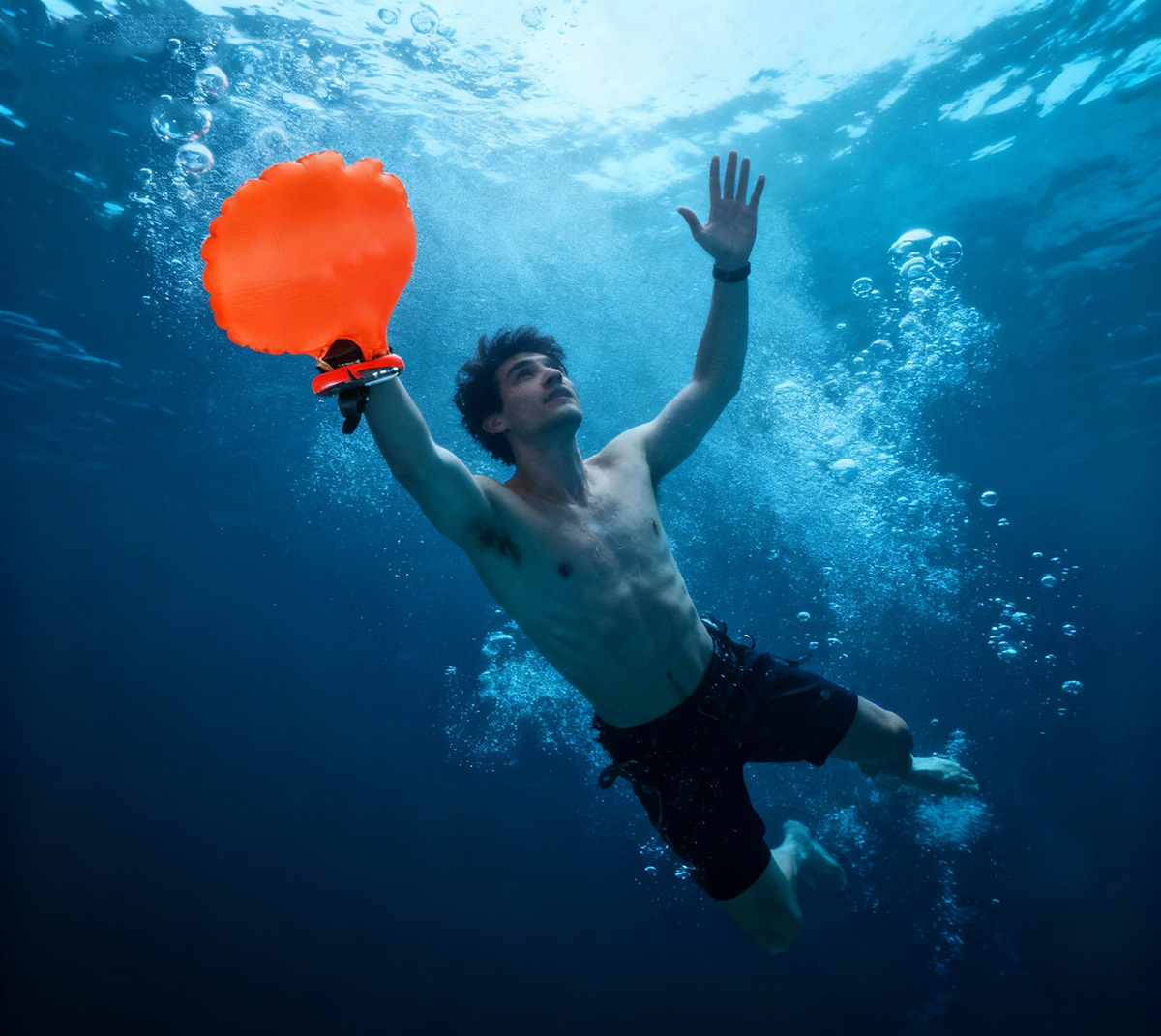 拉開(kāi)控制桿,手腕盒中彈出氣囊迅速充氣膨脹,形成浮力裝置,協(xié)助漂浮在水面,表帶上配有指南針