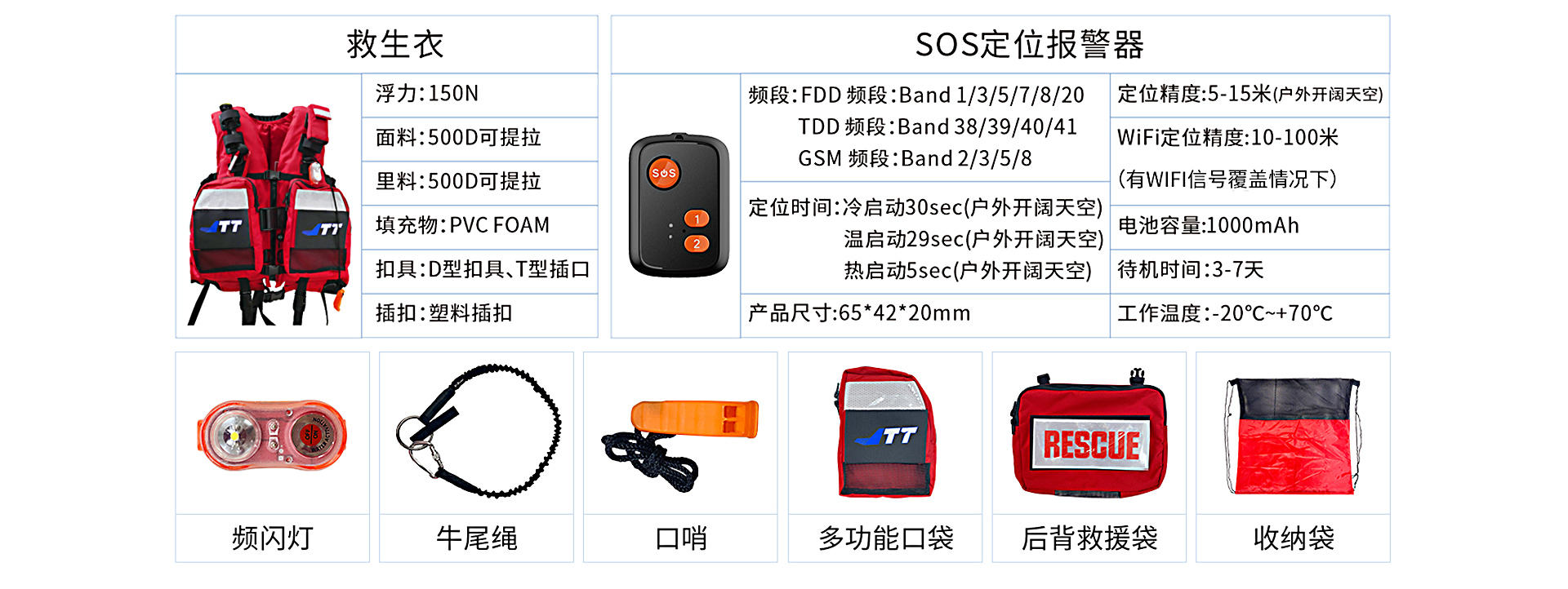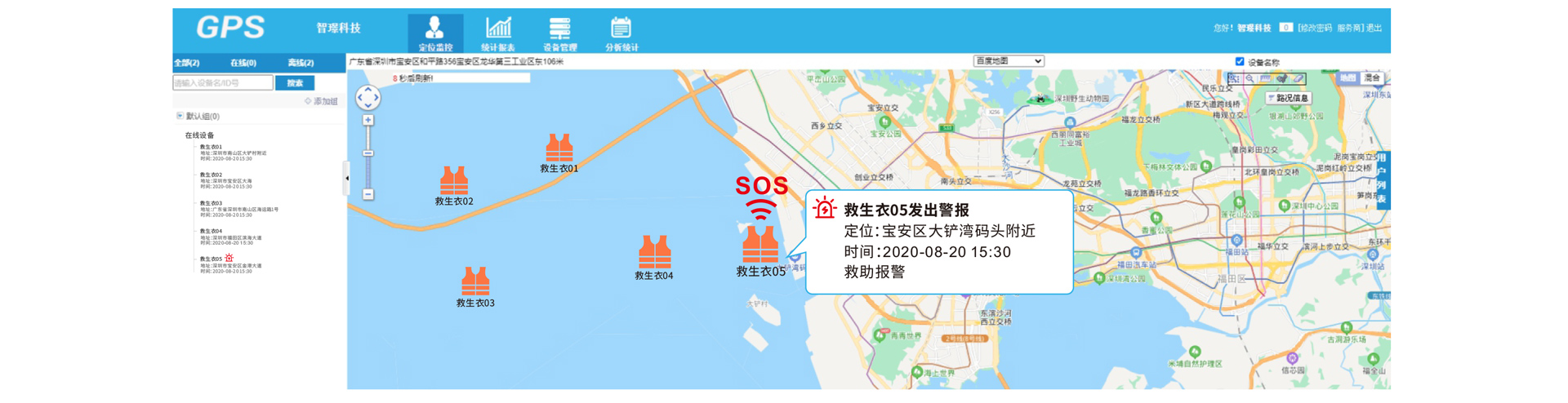 是為防汛搶險(xiǎn)救災(zāi)專門制作的,用于搶險(xiǎn)人員穿著和救助落水人員的閉孔泡沫救生衣,可應(yīng)對(duì)極端的水域情況。救生衣前胸設(shè)有PFD自救裝置,后背部設(shè)有牽引繩連接拉環(huán),同時(shí)配備哨笛、反光條、頻閃定位燈、SOS定位報(bào)警器等;具有定位功能,在手機(jī)APP及后臺(tái)管理平臺(tái)中能實(shí)時(shí)顯示定位器位置、電量、軌跡等,在緊急情況下救援人員可以通過(guò)SOS一鍵向平臺(tái)發(fā)出求救預(yù)警。它能夠隨時(shí)傳遞位置信息,大大提高救援行動(dòng)效率,及保障救援人員安全。