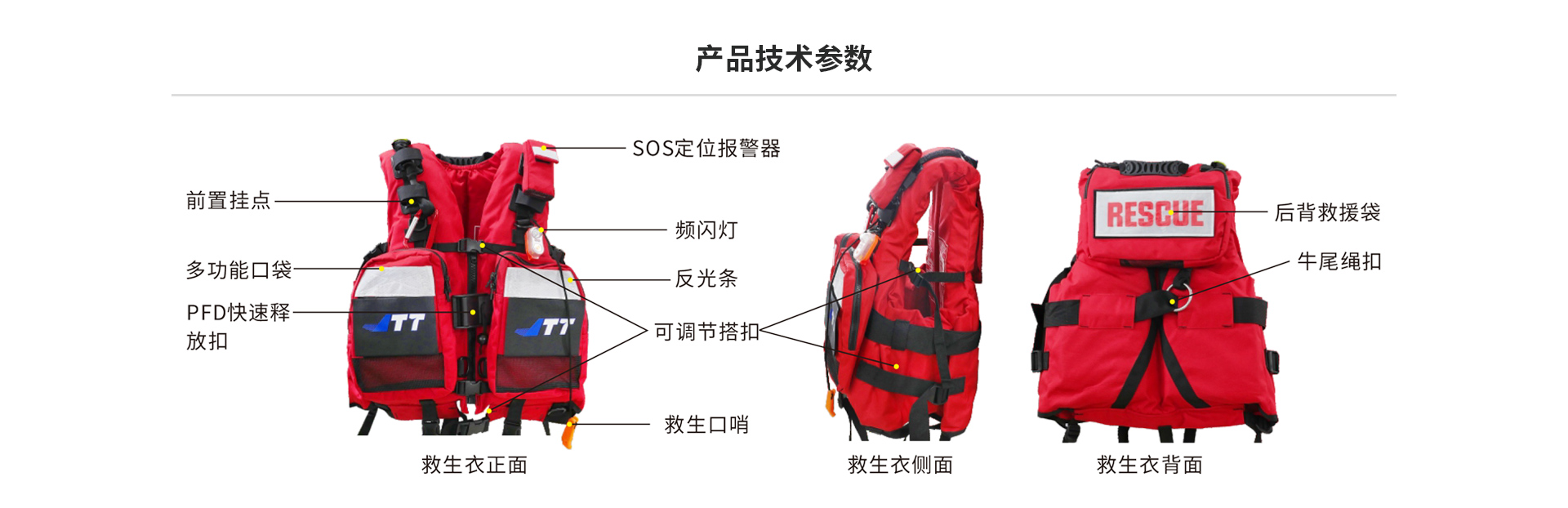救生衣背面設(shè)置松緊帶式熒光棒插槽,領(lǐng)后配有輕型可拖拽把手,救生衣胸前防水口袋設(shè)計(jì)魔術(shù)貼,可貼隊(duì)標(biāo)、姓名貼;胸襟兩側(cè)及背后有8條標(biāo)準(zhǔn)反光帶,便于夜間救援